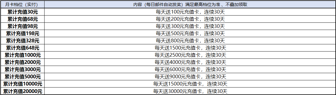 1.累充达到以下折后实付RMB金额可以获得月卡返利奖励,奖励持续发放30天,档位升级后每日奖励按最高档位发放,不会叠加,直至所激活的档位发够30天为止