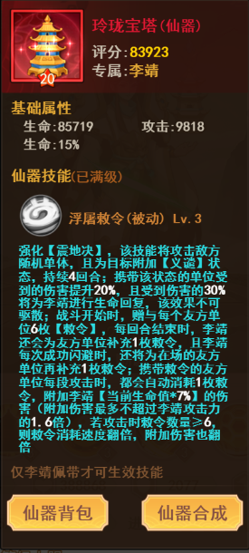 聪明的小伙伴应该也看出来了这个 [李靖敕令队] 的核心是谁了!没错,就是在于能造成强大AOE(群体多段)伤害的英雄!“玉帝、妲己、烛龙”都是我们强大的AOE强手,只要配置了 [ 李靖敕令队] 的大人们除了他的专属仙器还需要我们的专属AOE英雄哦!!